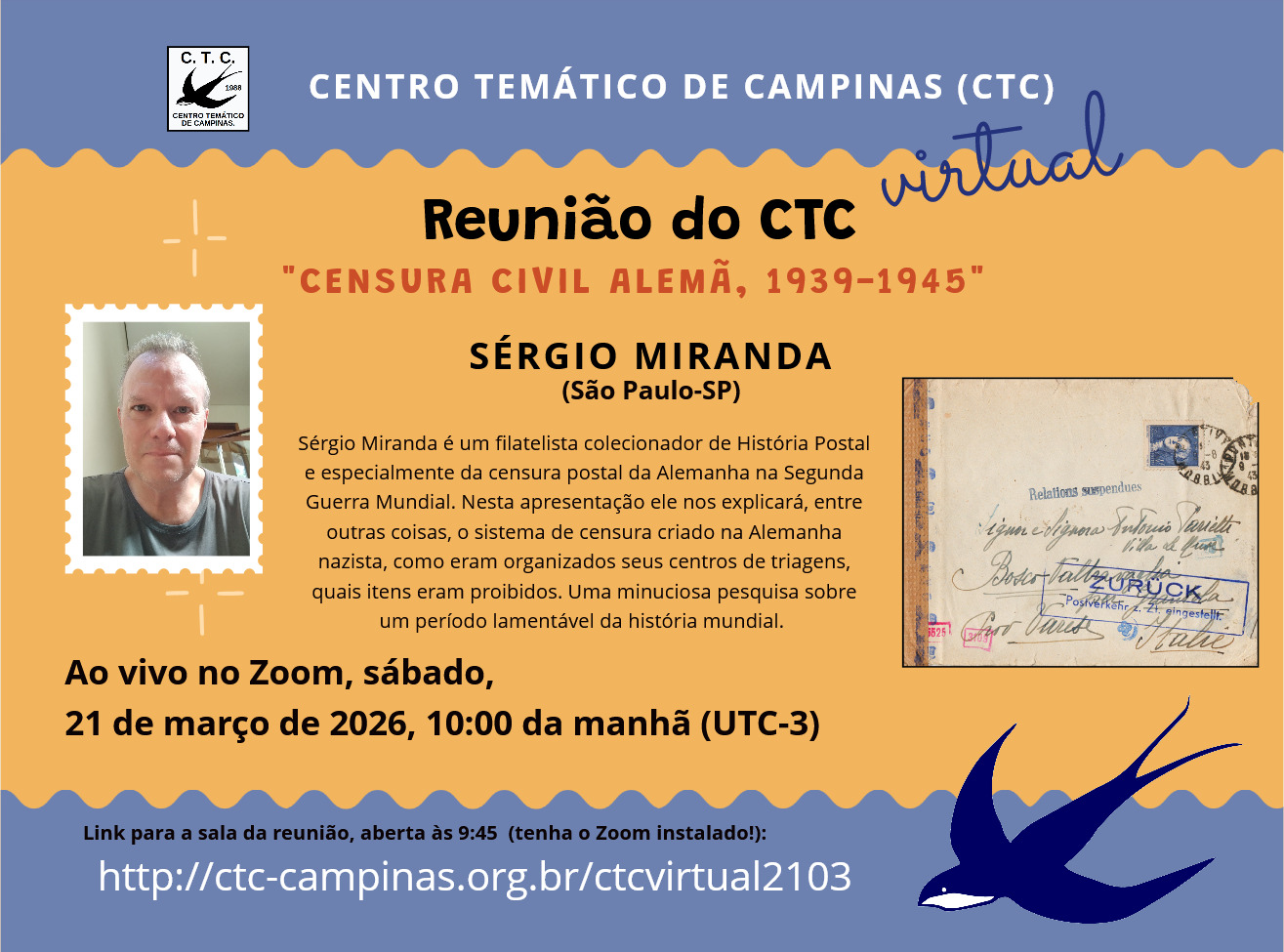 Convite para o CTC Virtual de Março de 2026, com o colecionador Sérgio Miranda, que falará sobre a Censura Civil na Alemanha 1939-1945.