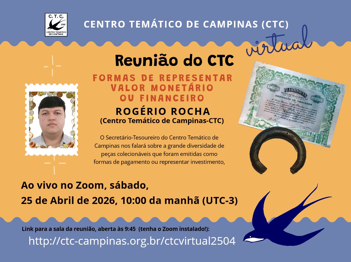 Lançado o calendário das reuniões mensais do CTC Virtual. A cada mês um colecionador e sua coleção ou um tema de colecionismo – Filatelia, Numismática, Cartofilia ou Telecartofilia.