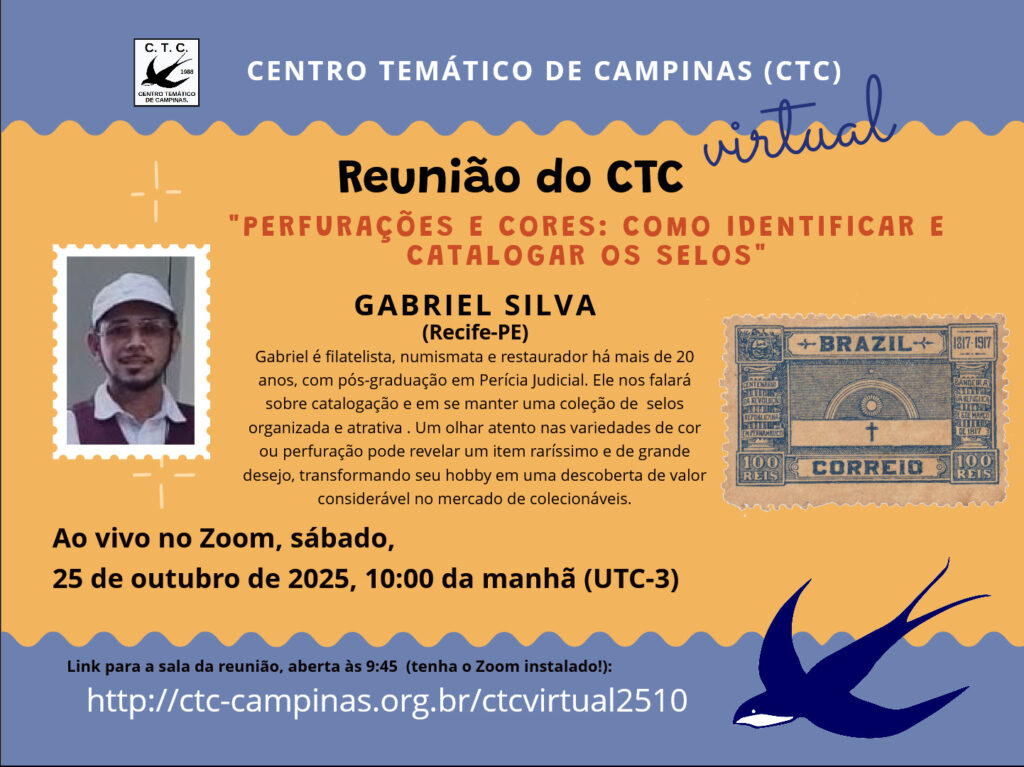 10:00 – Apresentação a cargo de Gabriel Silva (Recife-PE), que falará sobre a catalogação de uma coleção filatélica, de modo a mantê-la organizada e atraente.